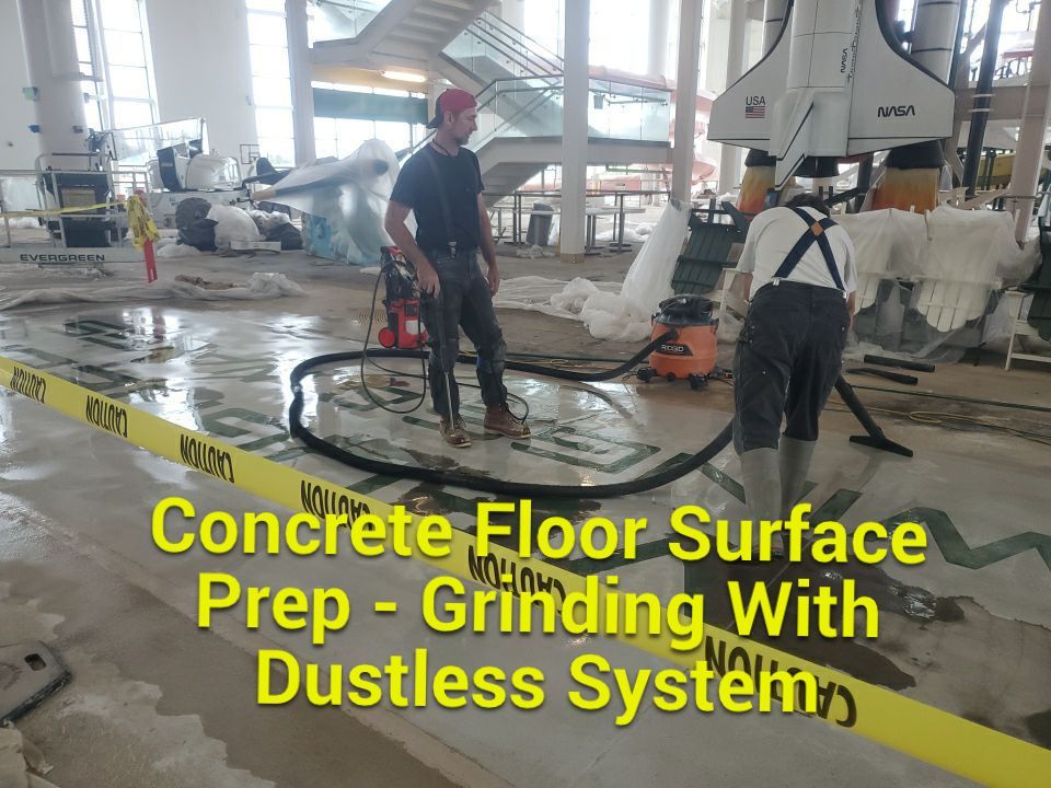 - Concrete Floor Work – After the removal of the carpet, we ground and removed the adhesive from the concrete. Also, we ground a large logo off the floor and recoated it with Sherwin Williams Acryla Deck Water Based epoxy.