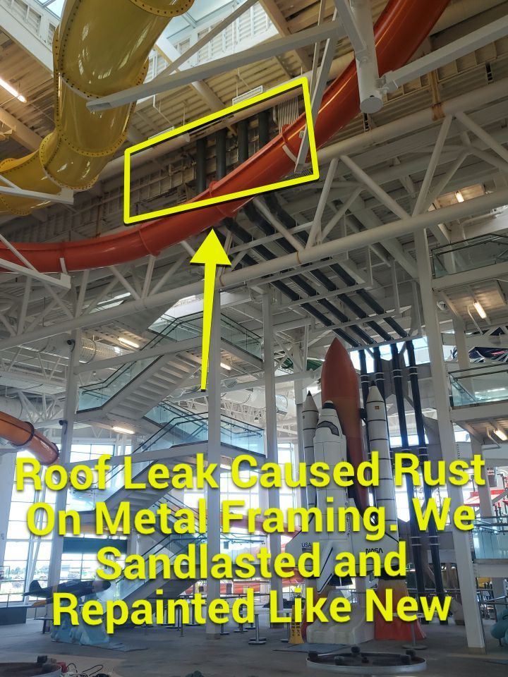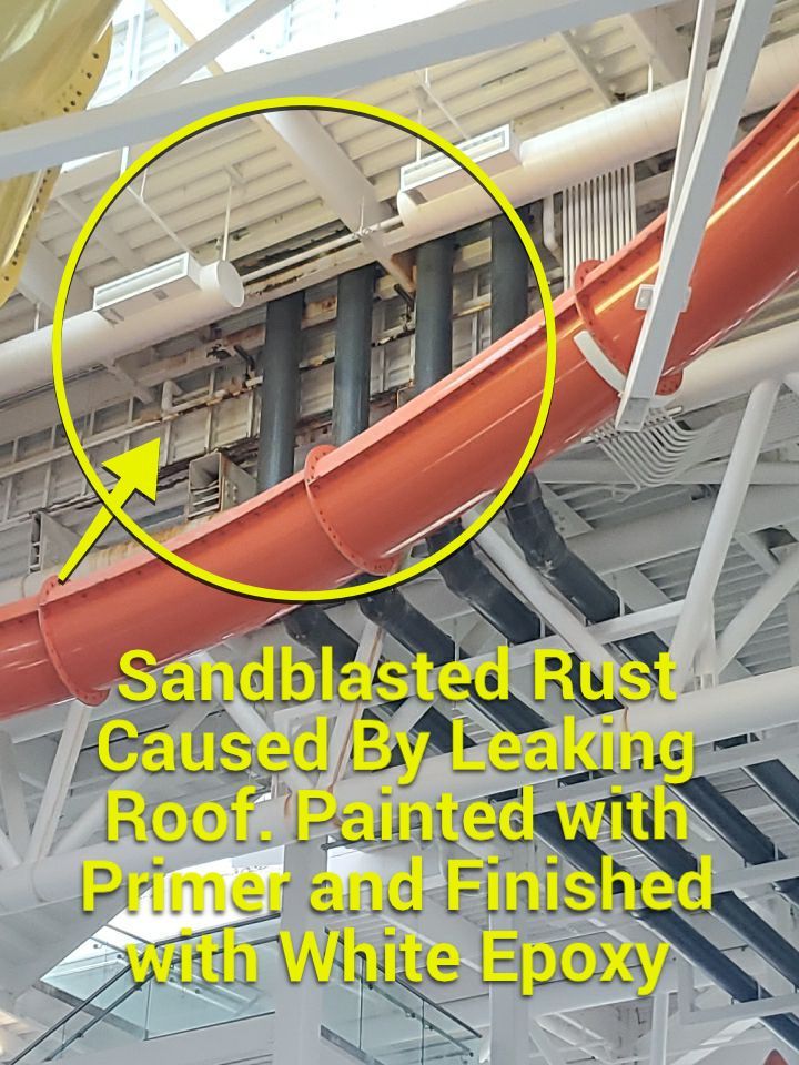The Problem – the new owner of Wings and Waves Water Park wanted to upgrade the appearance with new paint and drywall. Metal stairs and aluminum ductwork also needed sandblasting rusted areas and recoating. The water park’s extensive foot traffic created large areas of wear on the concrete floors and required new epoxy floor paint. The painting crew experienced challenges because of height and ductwork access, which required sandblasting and repainting.