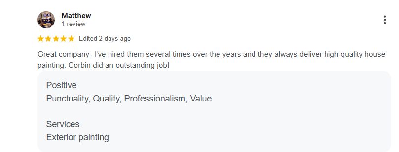 “Great company- I’ve hired them several times over the years and they always deliver high quality house painting. Corbin did an outstanding job!”